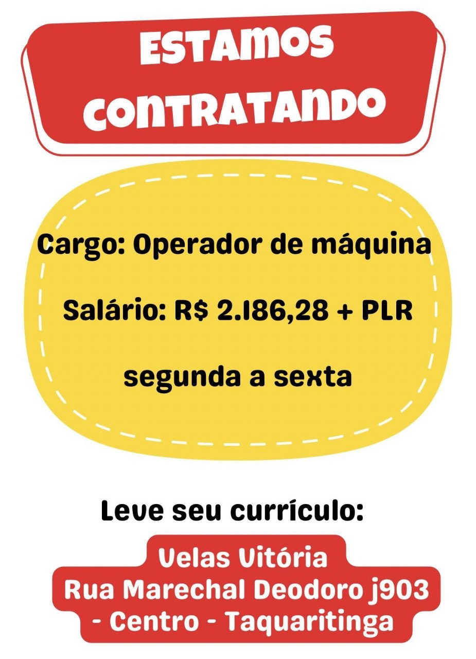 A tradicional empresa Velas Vitória, localizada no centro de Taquaritinga, está com três vagas abertas para o cargo de operador de máquina.
