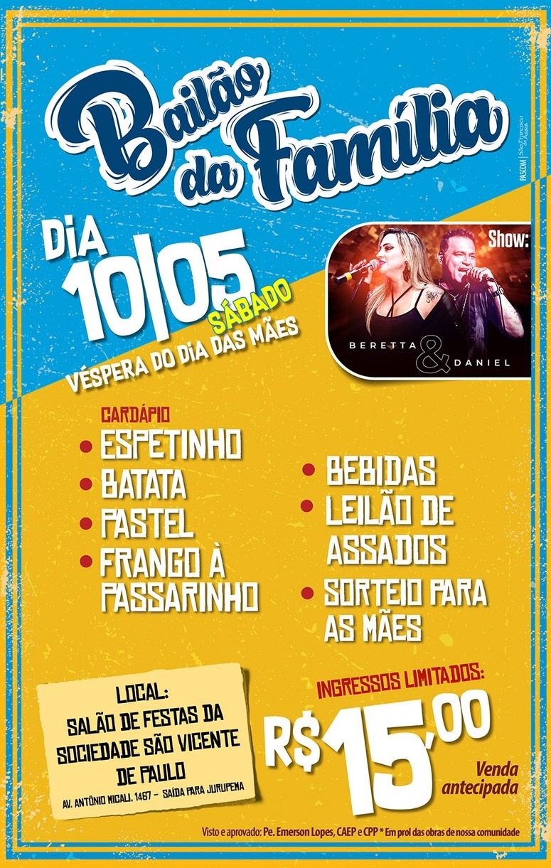 Em clima de confraternização e carinho, a cidade de Taquaritinga se prepara para celebrar a véspera do Dia das Mães com o tradicional Bailão da Família, marcado para o sábado, 10 de maio, a partir das 19h, no Salão de Festas da Sociedade São Vicente de Paulo, localizado na Avenida Antônio Micali, nº 1467, na saída para Jurupema.