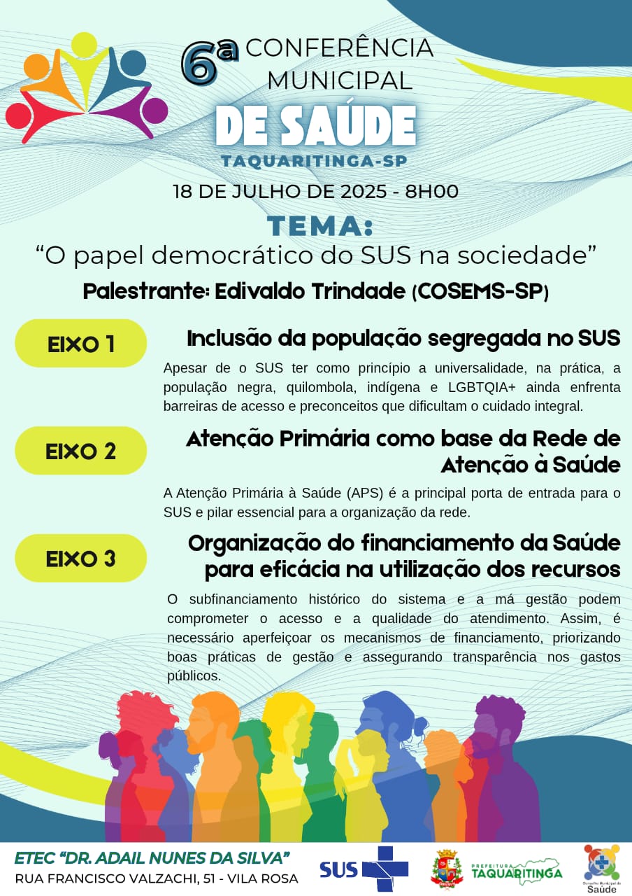A Prefeitura de Taquaritinga, por meio da Secretaria Municipal de Saúde, convida a população para um momento decisivo na construção de políticas públicas: a 6ª Conferência Municipal de Saúde, que acontece no dia 18 de julho de 2025, a partir das 8h, na ETEC “Dr. Adail Nunes da Silva”, localizada na Rua Francisco Valzachi, 51 – Vila Rosa.