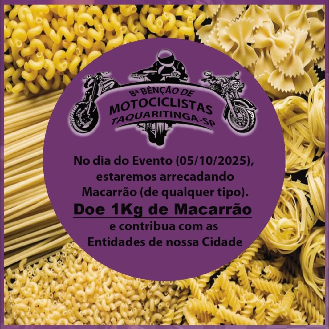 A cidade de Taquaritinga se prepara para mais uma edição da tradicional Benção dos Motociclistas, evento que chega à sua 8ª edição e promete reunir apaixonados por duas rodas em um momento de fé, união e solidariedade. Sob a organização do Black Eagle Moto Clube, a festividade já deu início à sua campanha social, que este ano foca na arrecadação de doações de macarrão destinadas às entidades assistenciais do município.