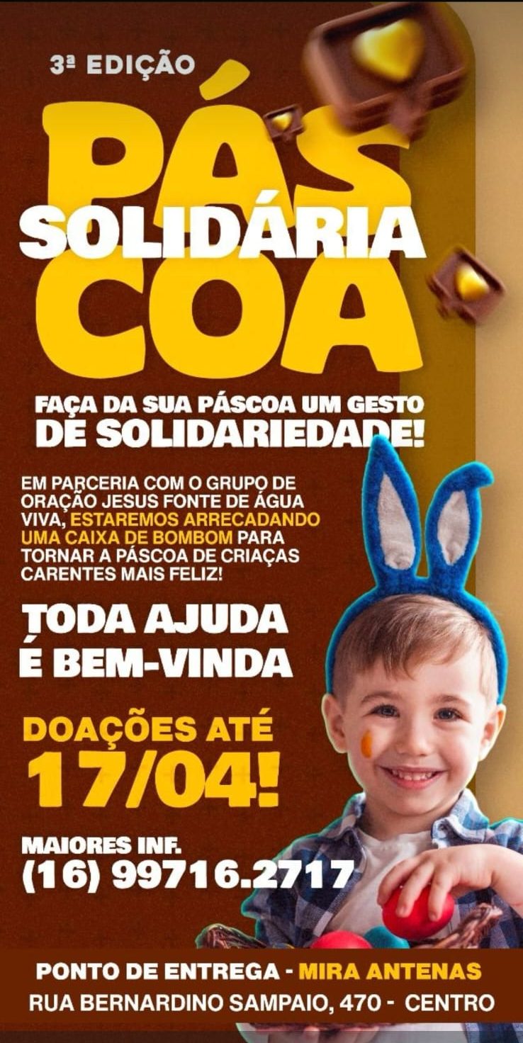 A campanha Páscoa Solidária vem se consolidando como um evento anual de impacto social, promovendo o espírito de generosidade e empatia. Se cada pessoa contribuir com um pouco, juntos será possível proporcionar um momento de felicidade para centenas de crianças nesta Páscoa.