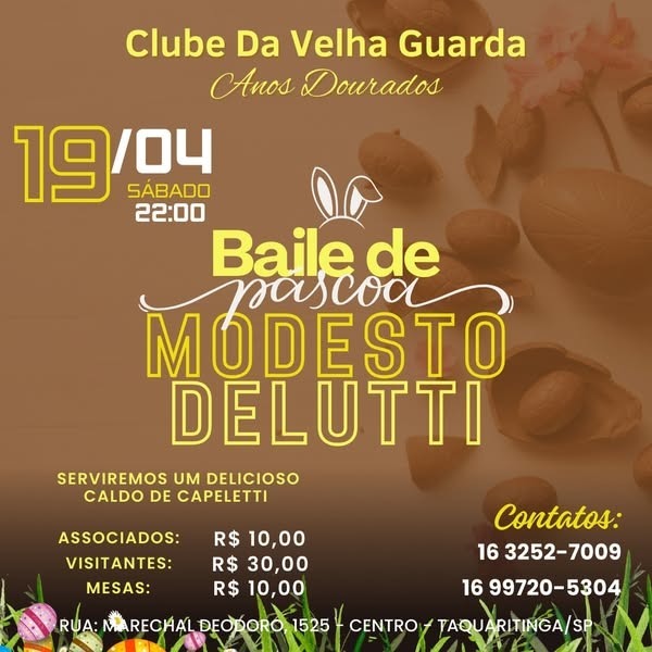 Neste sábado, dia 19 de abril, a cidade de Taquaritinga se prepara para reviver os melhores momentos da música e da dança no tradicional Baile de Páscoa do Clube da Velha Guarda. O evento, que começa às 22h, acontece no salão do clube localizado na Rua Marechal Deodoro, 1525 – Centro, e promete uma noite marcada por elegância, boa música e reencontros emocionantes.