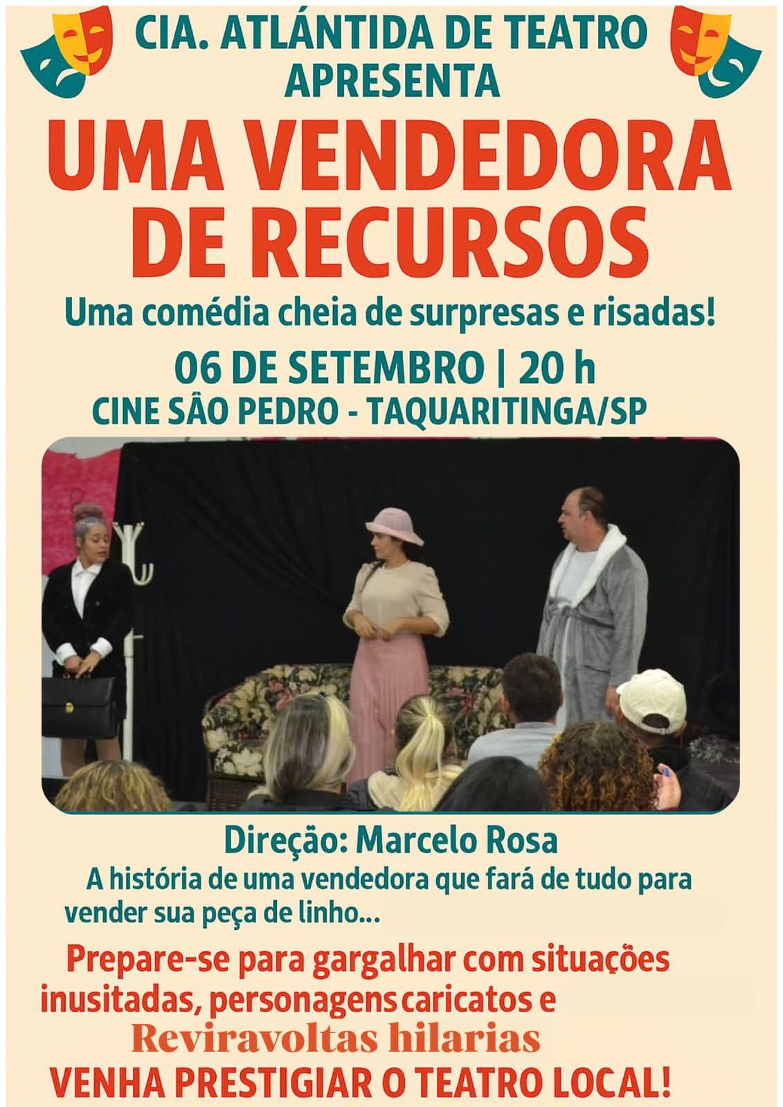 A cultura local volta a ocupar o palco do Cine São Pedro, em Taquaritinga, com mais uma produção da Cia. Atlântida de Teatro. A apresentação da comédia “Uma Vendedora de Recursos” promete arrancar gargalhadas do público, no dia 6 de setembro, a partir das 20h.
