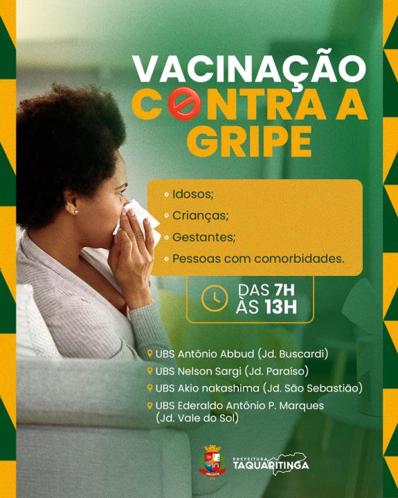 A Campanha de Vacinação contra a Gripe teve início em Taquaritinga na última segunda-feira, 7 de abril. Promovida pela Prefeitura, a ação visa imunizar os grupos prioritários e reforçar a prevenção de doenças respiratórias neste período de outono e inverno.