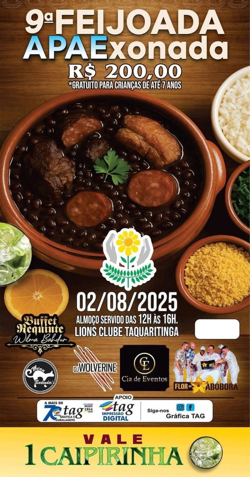 No dia 2 de agosto de 2025, a solidariedade e o sabor se encontram na 9ª edição da Feijoada APAExonada, evento tradicional em prol da APAE de Taquaritinga. Com início marcado para o meio-dia e encerramento às 16h, a programação será realizada no Lions Clube, reunindo comunidade, apoiadores e amantes de uma boa feijoada.