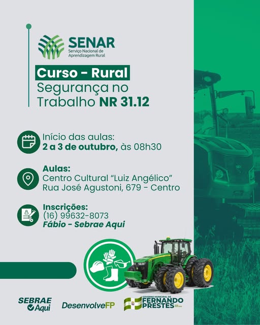 A Prefeitura de Fernando Prestes, em parceria com o SENAR (Serviço Nacional de Aprendizagem Rural) e o Sebrae Aqui, está oferecendo o curso gratuito Segurança no Trabalho Rural – NR 31.12, voltado para trabalhadores e colaboradores do setor agrícola. As aulas acontecem nos dias 2 e 3 de outubro, a partir das 8h30, no Centro Cultural “Luiz Angélico”, localizado na Rua José Agustoni, 679, no centro da cidade.