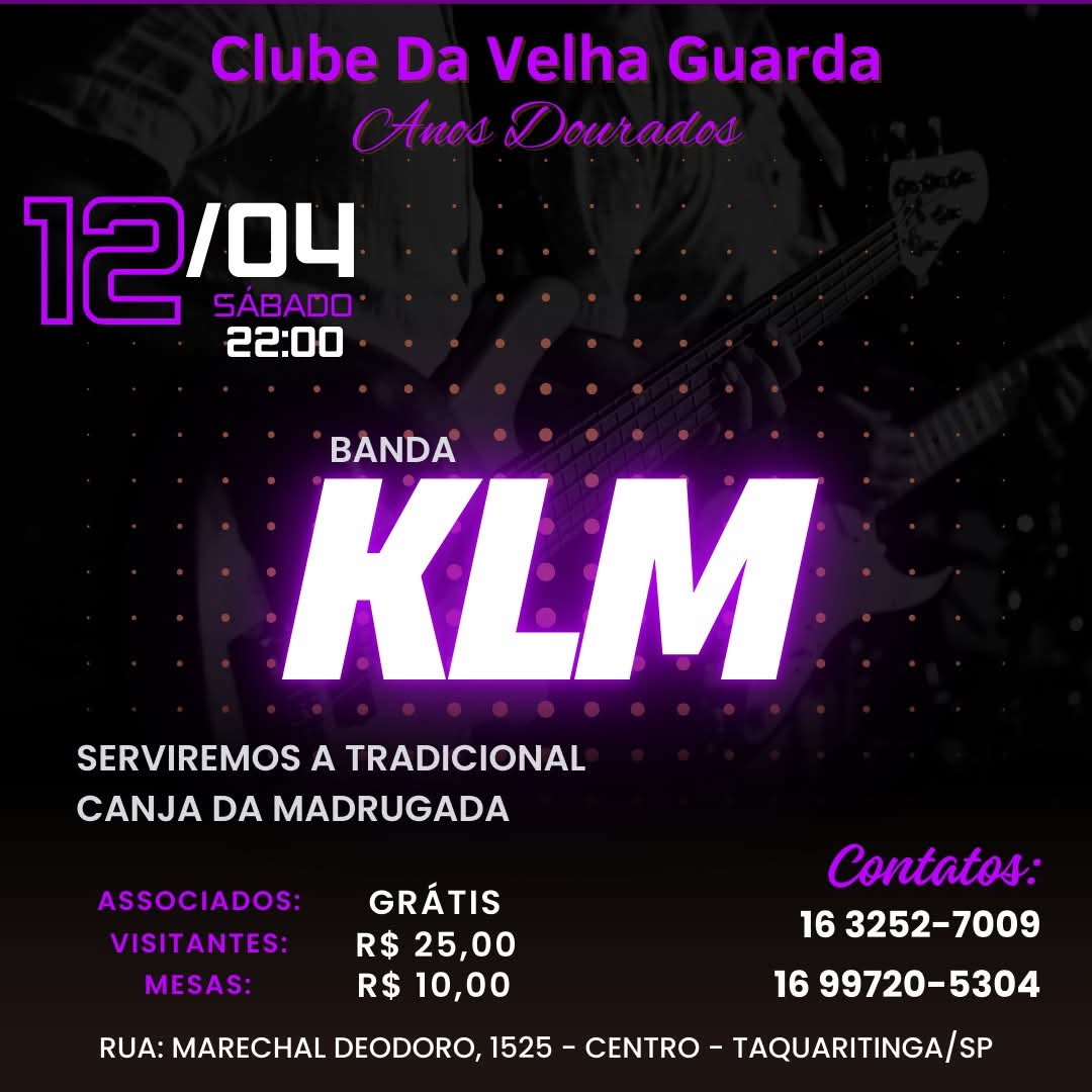 O Clube da Velha Guarda prepara uma noite memorável em Taquaritinga. No próximo sábado, 12 de abril, a festa “Anos Dourados” promete reunir gerações com muita música e tradição. A programação terá início às 22h, com apresentação da Banda KLM, reconhecida por seu repertório dançante e nostálgico.