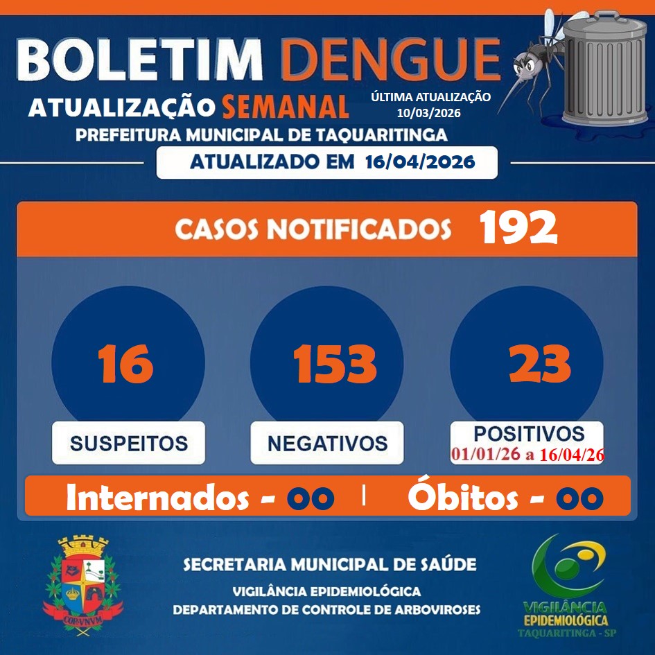 A Prefeitura de Taquaritinga divulgou nesta semana a nova atualização do boletim epidemiológico da dengue, com dados consolidados até 16 de abril de 2026. O relatório oficial informa 192 casos notificados no município desde o início do ano, reunindo ocorrências confirmadas, descartadas e ainda em investigação. Os números mostram que a cidade segue em estado de atenção, embora sem registros de internações ou mortes relacionadas à doença no período analisado.