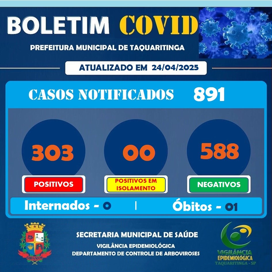 A Prefeitura Municipal de Taquaritinga divulgou nesta quinta-feira, 24 de abril de 2025, novo boletim epidemiológico da Covid-19, com números atualizados da situação da doença no município. Desde o início do ano, foram 891 casos notificados, dos quais 303 testaram positivo para o coronavírus. O levantamento aponta ainda que não há pessoas internadas ou em isolamento no momento, o que indica uma possível estabilização dos casos ativos na cidade.