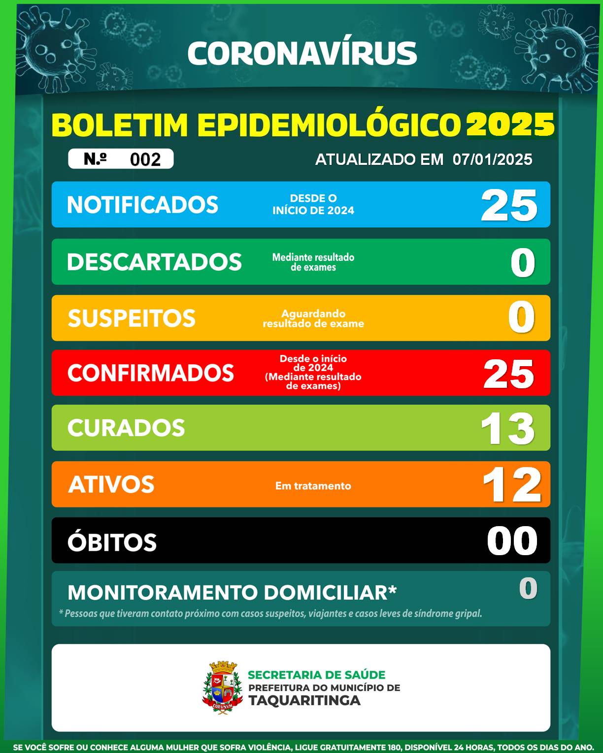 A Prefeitura de Taquaritinga, por meio da Secretaria Municipal de Saúde, divulgou nesta terça-feira (7) o Boletim Epidemiológico mais recente sobre a situação da Covid-19 no município. Desde o início de 2025, foram notificados 25 casos confirmados da doença, com 13 pacientes já considerados curados e outros 12 ainda em tratamento. Felizmente, não há registro de óbitos até o momento.