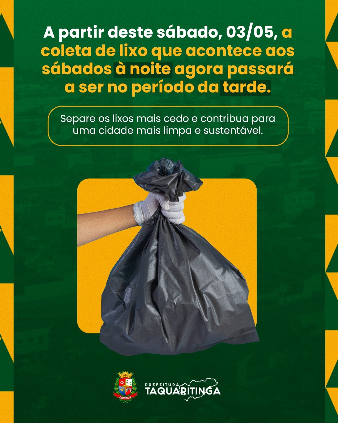 A Prefeitura Municipal de Taquaritinga comunicou uma mudança importante no serviço de coleta de lixo. Desde sábado, 3 de maio, a coleta, que antes era realizada no período da noite, passará a ocorrer no período da tarde, somente aos sábados. A mudança visa otimizar o processo e trazer mais comodidade aos moradores.
