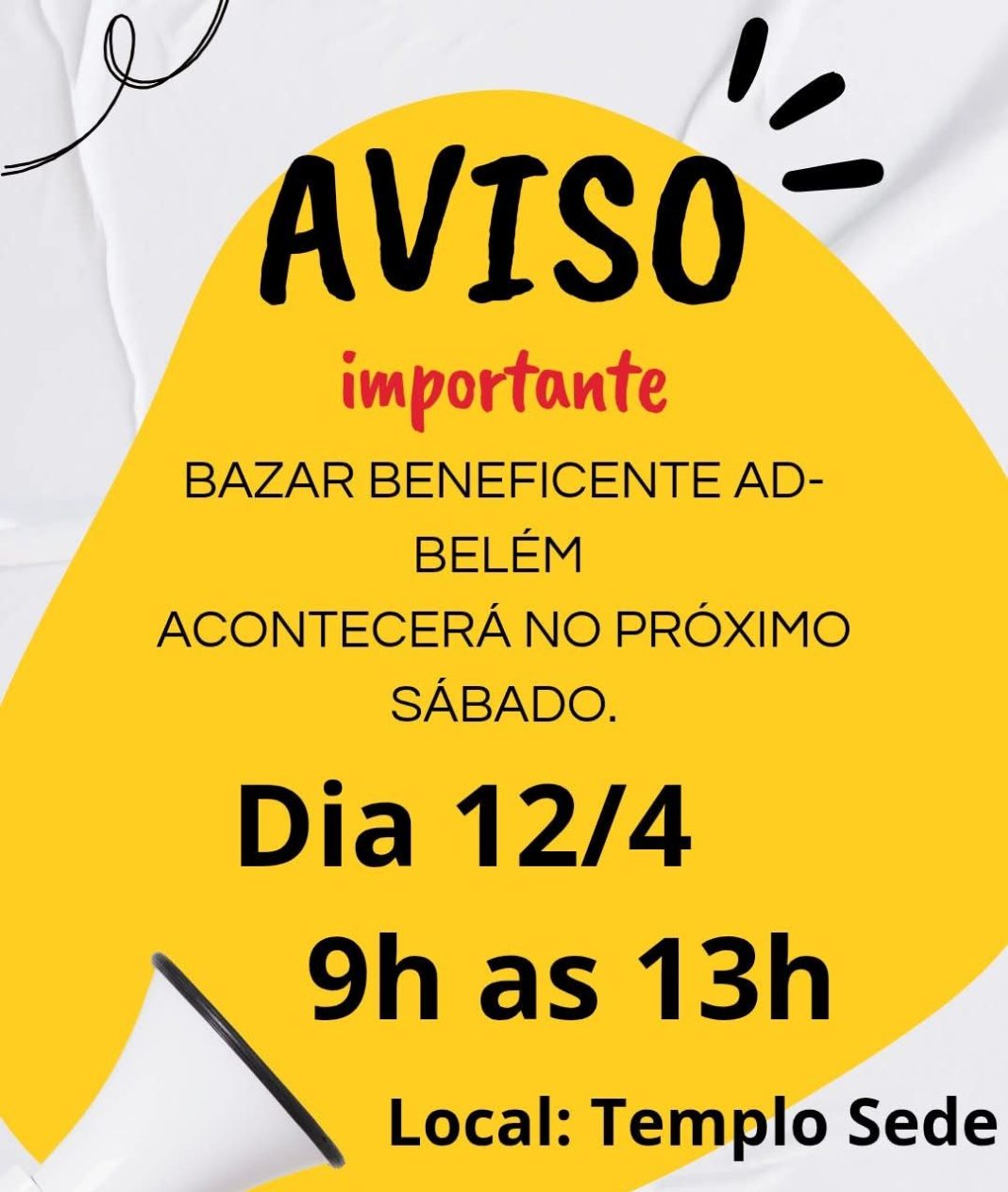 Um evento solidário será realizado no próximo sábado, 12 de abril de 2025, das 9h às 13h. Trata-se do Bazar Beneficente da Igreja Evangélica Assembleia de Deus – Ministério Belém, organizado com o objetivo de contribuir com as atividades sociais da comunidade. A iniciativa ocorrerá no Templo Sede, localizado na Rua 24 de Outubro, nº 100, Vila Di Santi, logo abaixo do Supermercado Ipiranga – Loja 2.