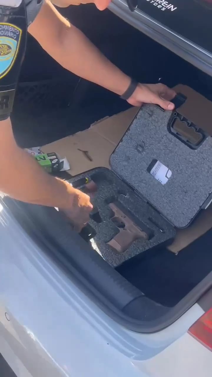 De acordo com informações da Polícia Militar, o automóvel Audi/A3 foi abordado após sair do local em direção ao município. Durante a revista, os agentes localizaram no porta-malas a arma de fogo, acompanhada de uma maleta, três carregadores e dezenas de munições.