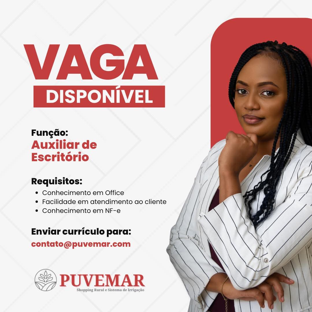A Puvemar – Shopping Rural e Sistema de Irrigação anunciou a abertura de uma vaga para Auxiliar de Escritório, ampliando seu quadro de colaboradores e sinalizando a busca por profissionais com perfil administrativo e habilidades operacionais. A oportunidade foi divulgada oficialmente pela empresa e já está com processo seletivo em andamento, com recebimento de currículos por meio eletrônico.