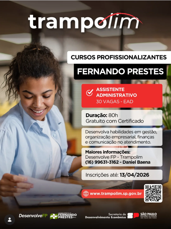 A Prefeitura de Fernando Prestes anunciou a abertura de inscrições para o curso gratuito de Assistente Administrativo, iniciativa que integra o programa municipal Desenvolve FP em parceria com o programa estadual Trampolim. A ação tem como objetivo ampliar o acesso à qualificação profissional, oferecendo oportunidades para jovens e adultos que buscam inserção ou recolocação no mercado de trabalho.
