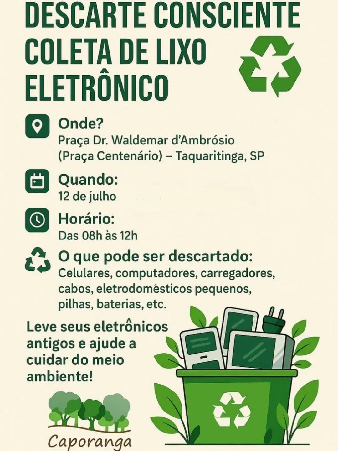 Na próxima sexta-feira, 12 de julho, Taquaritinga dará mais um passo em direção à sustentabilidade com a realização da coleta de lixo eletrônico, promovida na Praça Dr. Waldemar d’Ambrósio (Praça Centenário). A ação acontece das 8h às 12h e tem como principal objetivo conscientizar a população sobre a importância do descarte correto de resíduos tecnológicos.