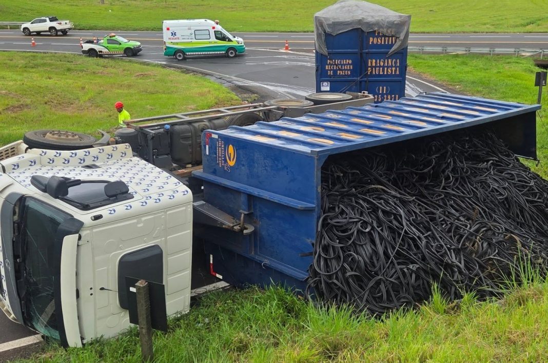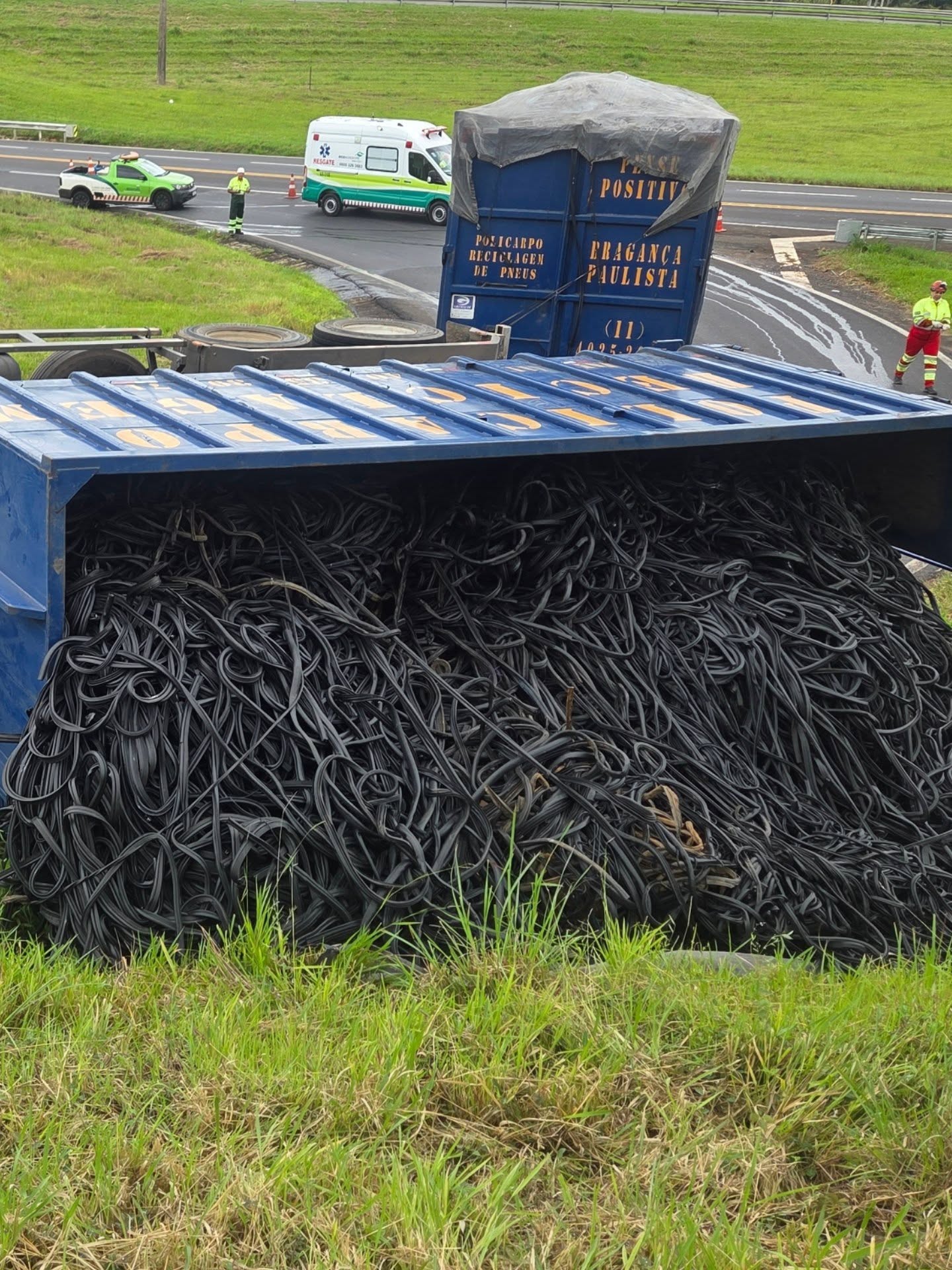 De acordo com informações apuradas no local, o caminhão, com placas de Bragança Paulista, tombou na pista envolvendo uma das caçambas e também a cabine do veículo, o que provocou a dispersão parcial da carga e exigiu atenção redobrada de quem passava pela via naquele momento. Apesar do impacto e do susto, o motorista conseguiu sair do veículo sem sofrer ferimentos.