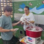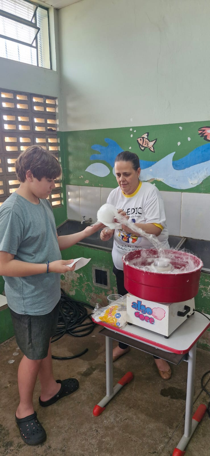 As crianças aproveitaram um delicioso lanche preparado com carinho, que incluiu cachorro-quente, bolo recheado, guaraná, algodão-doce e sorvetes.