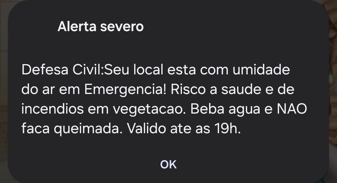 Na tarde desta terça-feira (10), a Defesa Civil do Estado de São Paulo disparou um alerta severo de emergência por baixa umidade do ar para todos os celulares em território paulista. O comunicado, exibido nas telas dos aparelhos, informa que a umidade atingiu níveis críticos, oferecendo risco à saúde da população e aumentando significativamente as chances de incêndios em áreas de vegetação.