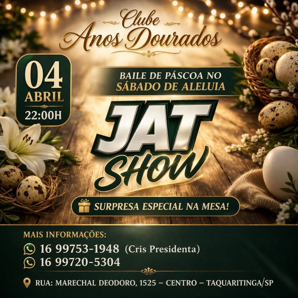 O Clube Anos Dourados, em Taquaritinga, promove no próximo dia 4 de abril, a partir das 22h, um Baile de Páscoa que integra a programação festiva do Sábado de Aleluia, com proposta de entretenimento voltada ao público adulto e familiar. O evento contará com apresentação da banda JAT Show, além de ambientação temática e ações voltadas à experiência dos participantes.